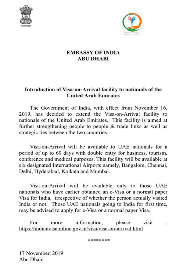 On Saturday, in New Delhi, there was an abolishment in the law permitting visa-on-arrival facility to the UAE nationals for a 60 day duration with double entry for tourism, business, conference and medical purposes.