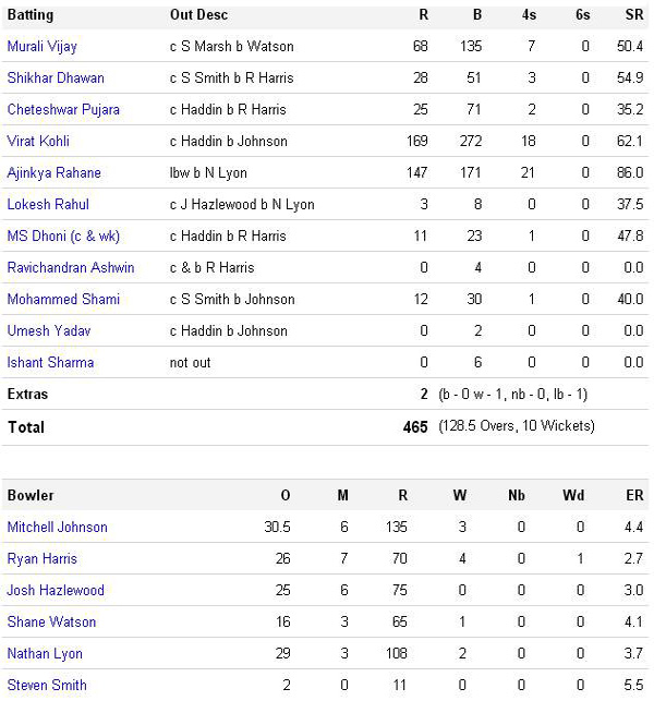 India started the batting with a overnight score of 462/8 and just added 3 runs to the earlier one as India lost remaining 2 wickets in the beginning only. Australia started its second innings aggressively, openers David Warner (40) and Chris Rogers (69) played to lead Australia towards winning. At a stage Australia were not comfort to score more because Indian bowlers tightened the game and none have scored more runs other than Shuan Marsh (62*), Ryan Harris is on crease at day ending with 8 runs.